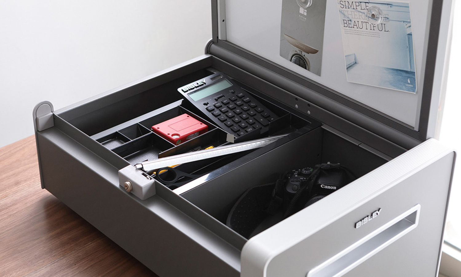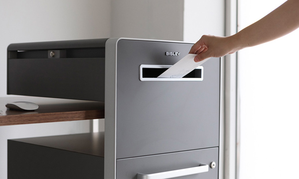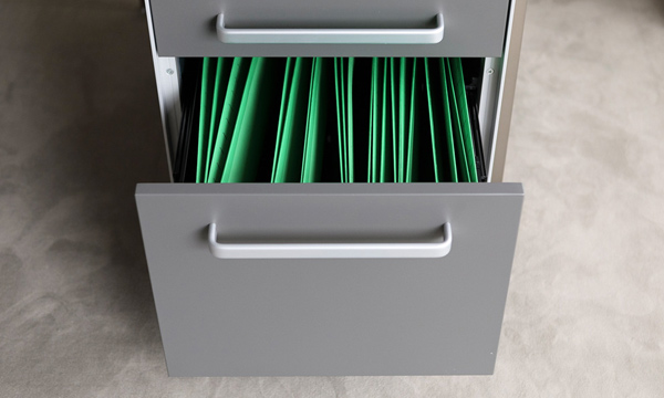 最下段の引き出しの引き出しの両端にA4サイズのファイル(ハンギング)フォルダーを引っかけて使用することができます。